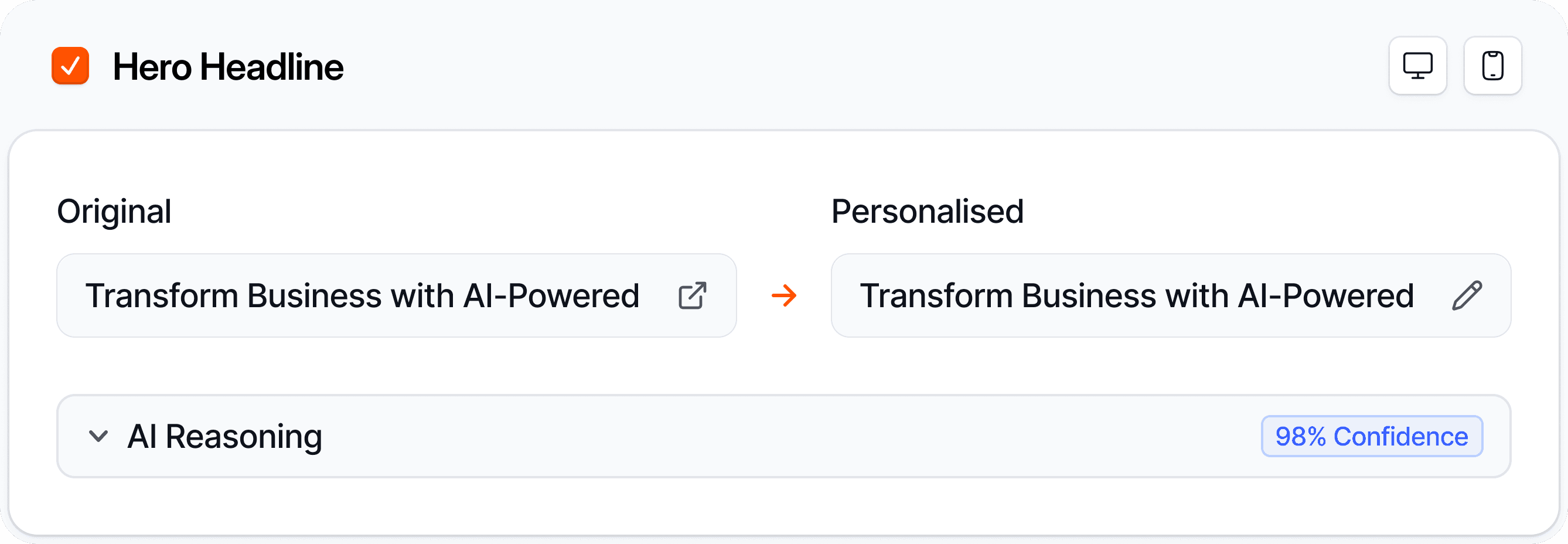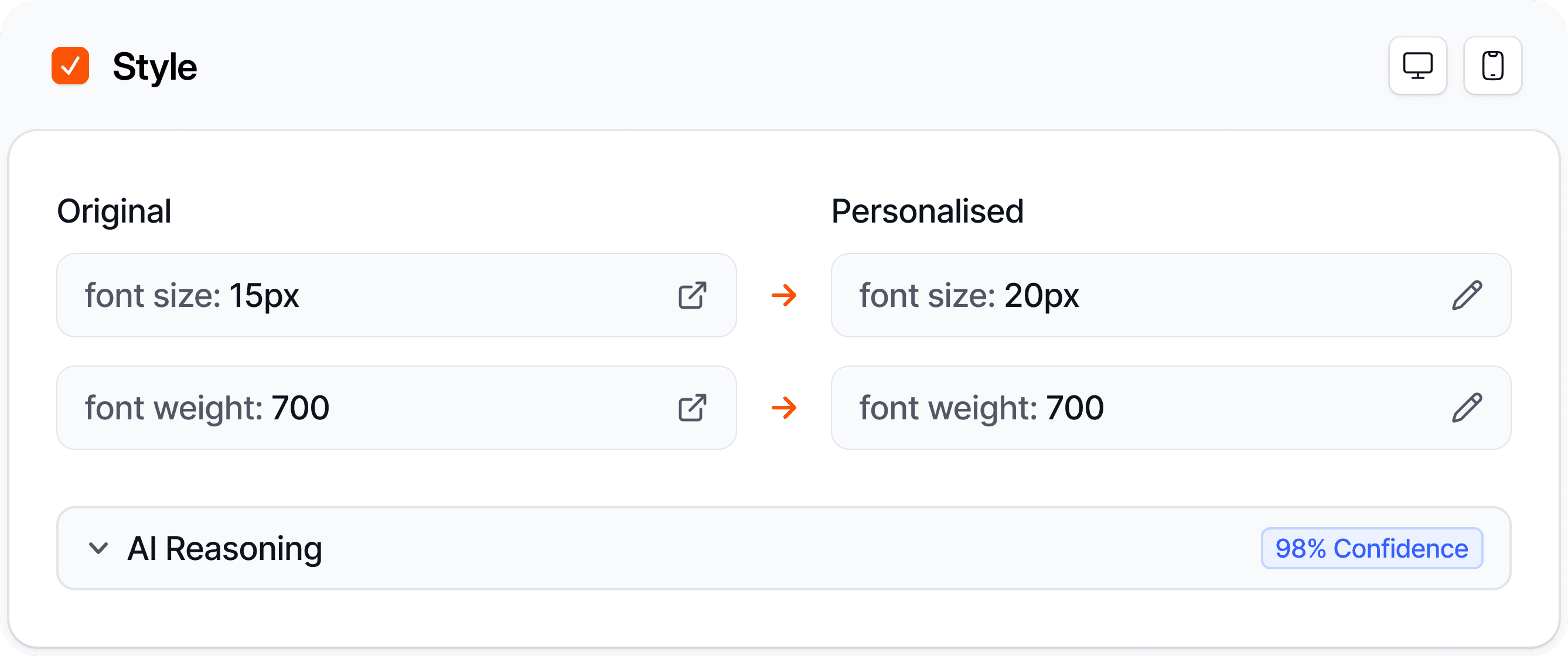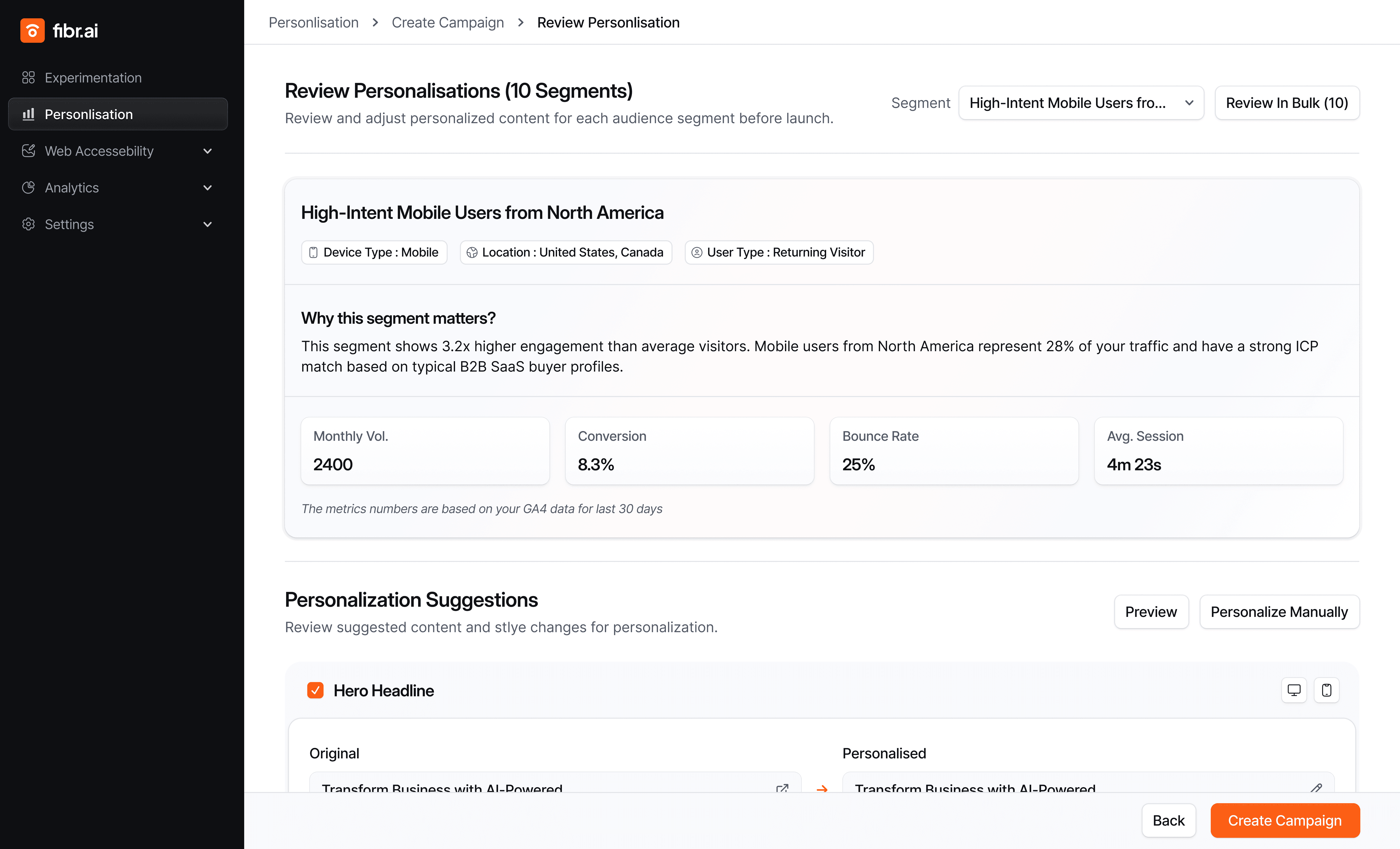 After adding segments AI works on the segments and suggests what personalisation changes in Text, Images, fonts you can do in your segments in order to optimise it.